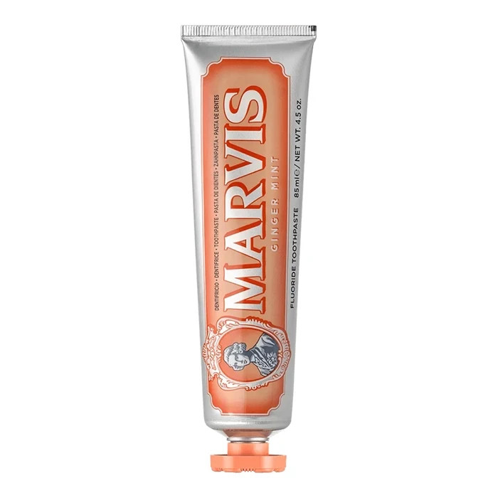 85 میلی لیتر خمیردندان زنجبیل و نعناع مارویس Marvis Ginger Mint حاوی مواد موثر خالص و قوی برای محافظت از دندان ها در برابر پوسیدگی، رفع پلاک های باکتریایی، پاکسازی جرم های سرسخت و تازگی بخشی دهان می باشد. خمیردندان مارویس دارای طراحی لوکس و طعم ادویه ای انرژی بخش زنجبیل نارنجی و خنک کننده نعنایی برای ماندگاری طولانی مدت احساس راحتی دهان و سبکی تنفس است. این خمیردندان همچنین حاوی فلوراید 0.2 درصد برای محافظت در برابر پوسیدگی و دارای بافت فشرده متفاوت همراه با طعم جذاب است و ترکیبی از احساسات سنتی، مترقی و جذاب را برای لذت بخش کردن برنامه روزانه محافظت از دندان فراهم می کند.